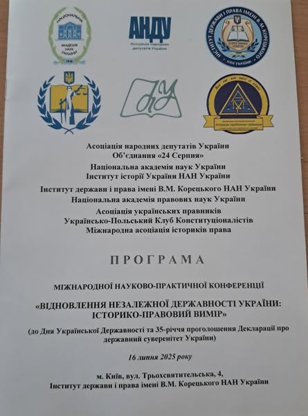 16 липня в Інституті держави і права імені В. М. Корецького НАН України відбулася Міжнародна науково-практична конференція «Відновлення незалежної державності України: історико-правовий вимір», співорганізатором якої стала Асоціація народних депутатів України.